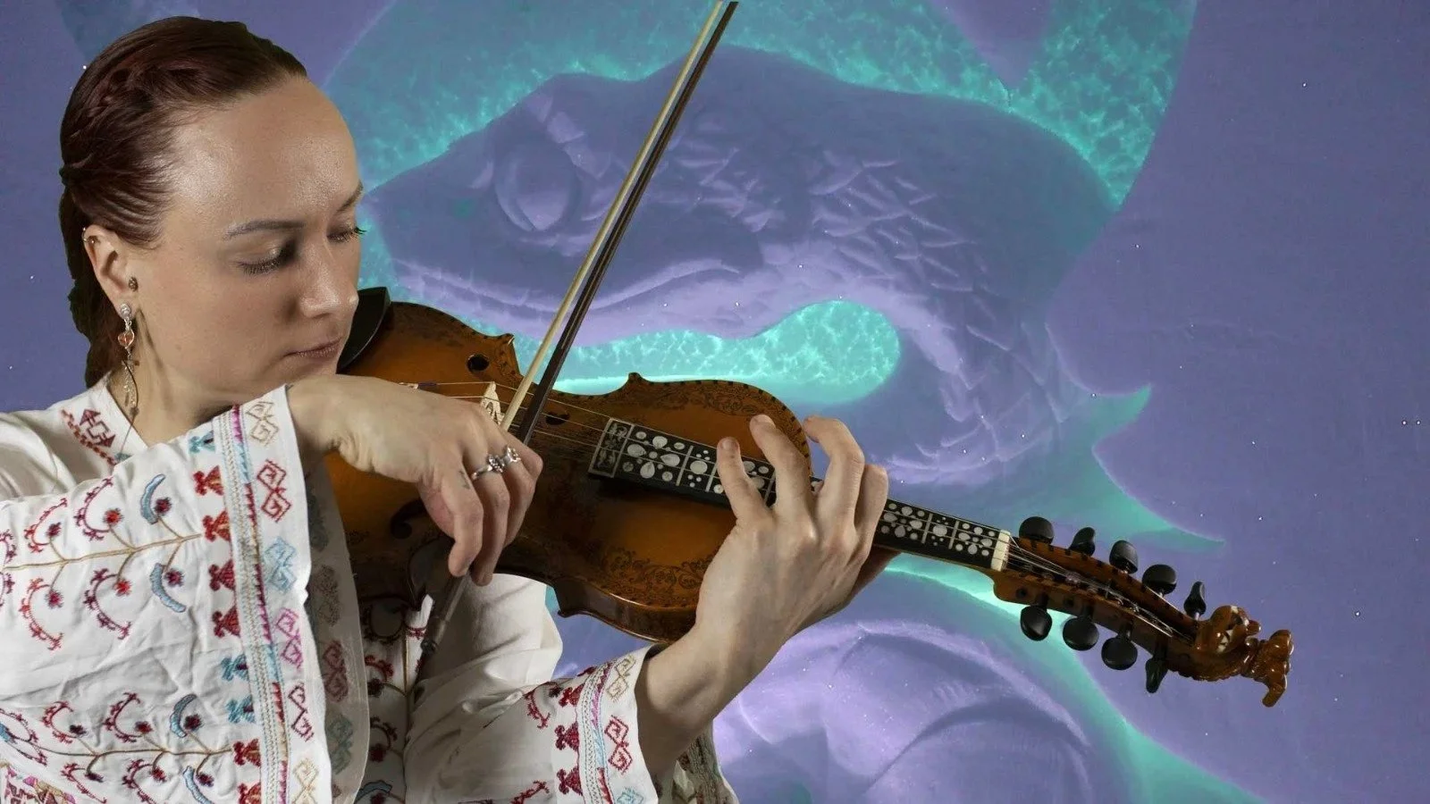 In addition, Luíra performs on various ancient, indigenous and folk instruments, such as her Sami framedrum, jaw harp, Finnish jouhikko, Norwegian hardanger fiddle and knuckles and bones.